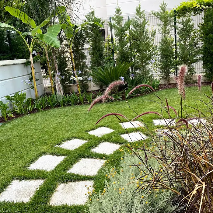 Bu bahçemizde mevcut olan bir bahçeye belli noktalarında dokunuşlar yapıldı. Bahçede çim olmayan sorunlu alanlara, prekast beton adım taşı uygulaması yapılarak, bitkiler, sebze yetiştirme kasaları, bahçe içinde sirkülasyonu sağlayacak adım taşı uygulamaları ilave edildi. Bitkisel olarak vurgu bitkileri renk, doku ve koku oluşturabilecek bitkiler dikildi. Görsel değeri yüksek bitkiler zemine doğal taş(dolamit) yerleştirilerek zenginleştirildi.