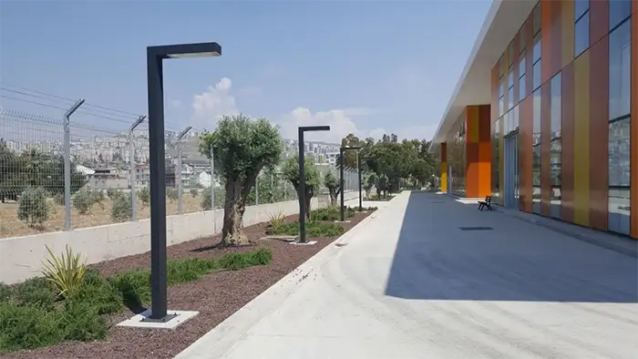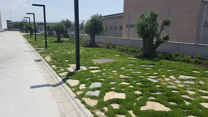 Bu bahçemizde çimsiz yeşil alanlar, dichondra repens (fare kulağı) ile kayrak zemin uygulamaları, rosmarinus officinalis prostratus (yayılıcı kuşdili) ile doku oluşturuldu. Fotoğraftaki resimde okul mimarisi ile uyumlu düzenleme. Bakımı kolay, su tüketimi az görsel değeri yüksek bahçe.